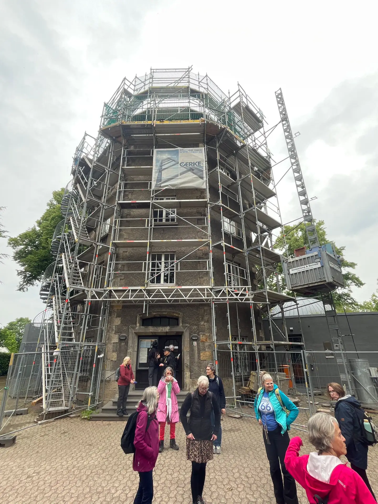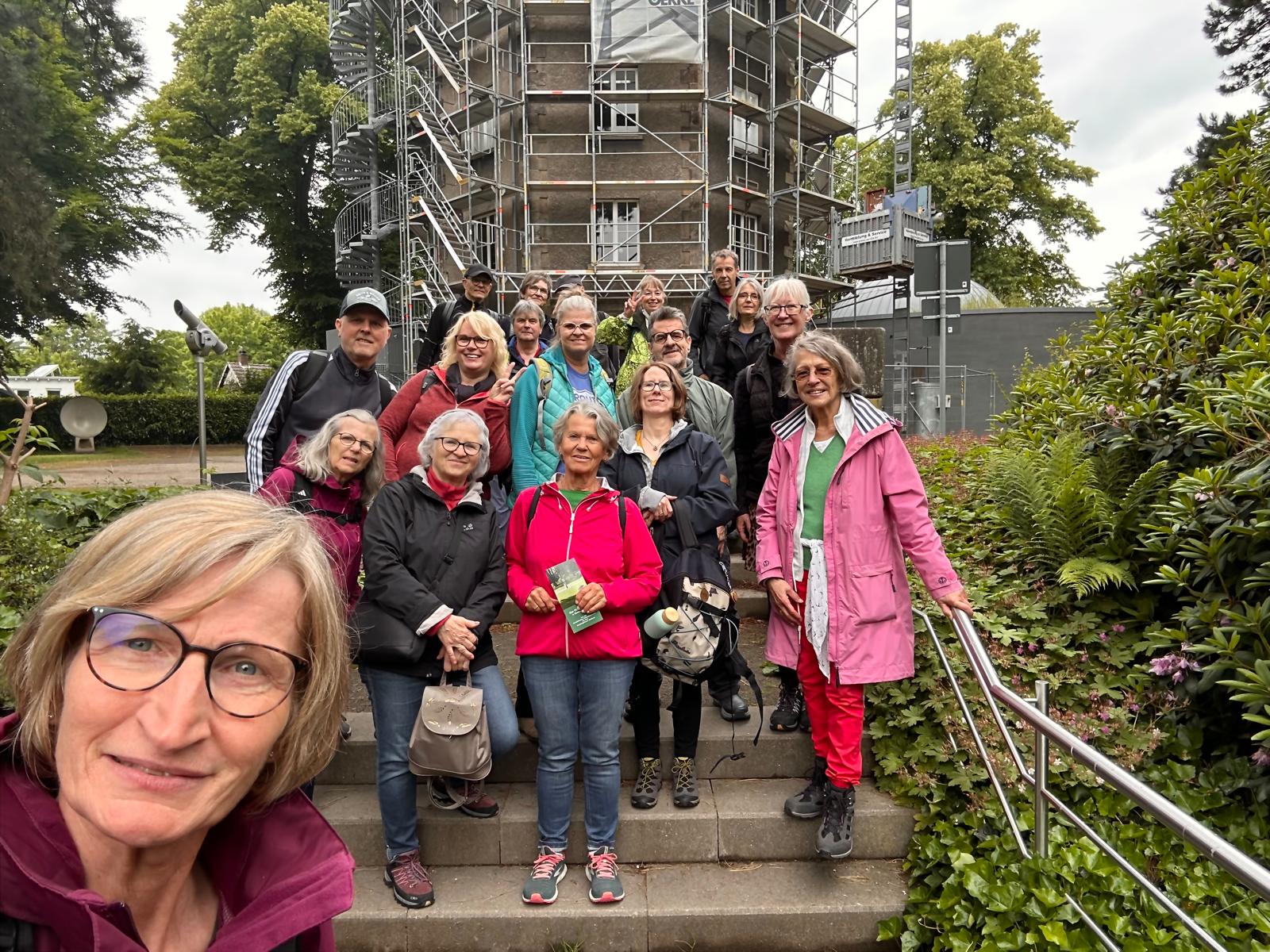 Anschließend ging es weiter zum Turm. Hier lautete die Quizfrage: „Wie heißt dieser Turm?“ – Die Antwort: Volkssternwarte. Unterwegs traf uns ein weiterer Wanderer am Rodelberg, der wegen einer Zugverspätung später dazukam.
