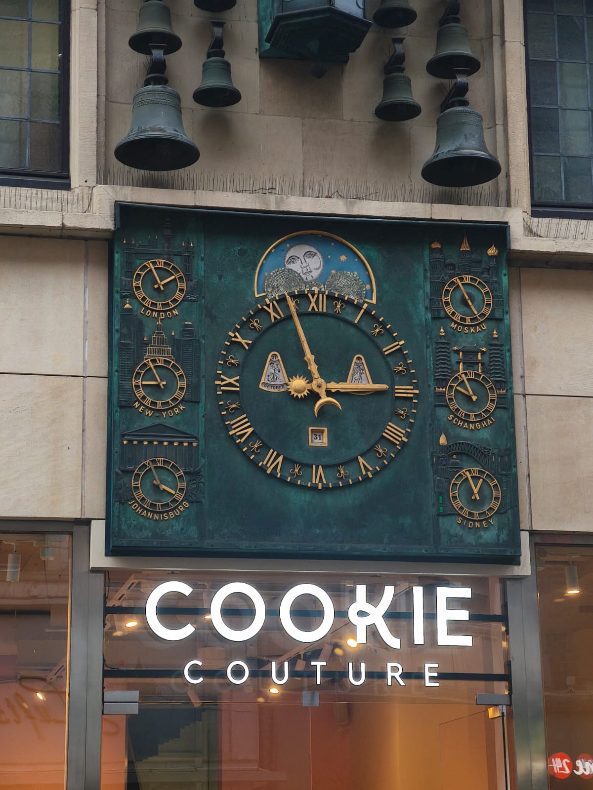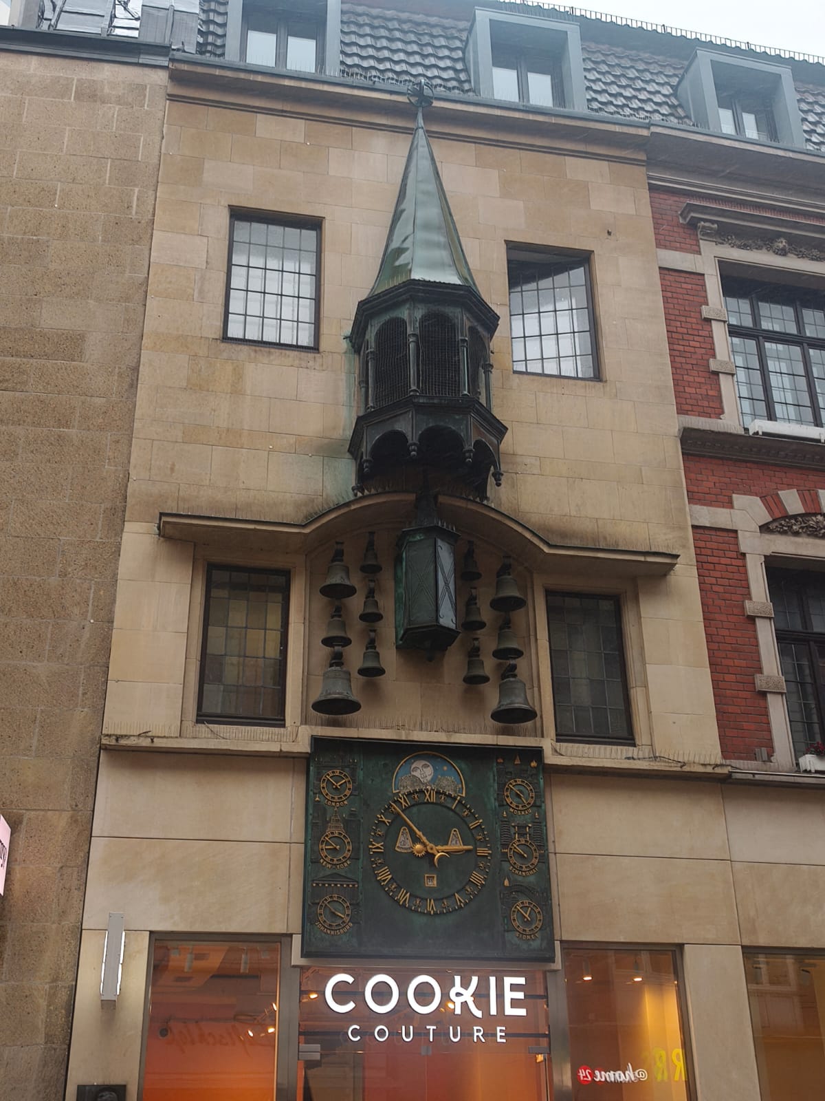 Im Anschluss gingen wir in ein Café. Plötzlich setzte starker Regen ein. Wanderführer Ralf Geerk zog in Erwägung, die Tour wegen des starken Regens abzubrechen und nach Hause zu fahren. Nach etwa 10 Minuten ließ der Regen jedoch nach, sodass wir weiter zur Weltzeituhr gehen konnten.